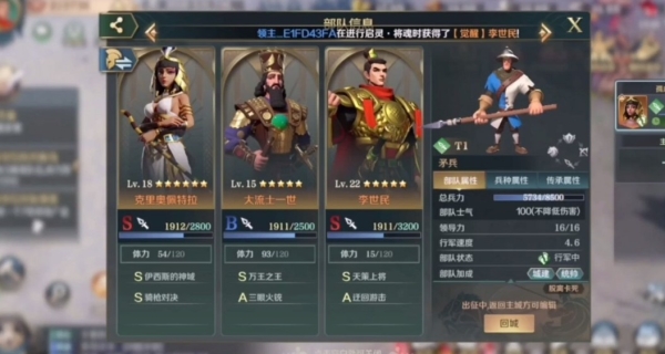 阵容3:嬴政+北条时宗+君士坦丁:这套阵容是可以在后续都拥有一席之地的阵容,嬴政会送一个紫色的,即便是紫色的也是可以用的,后期存够残片也是可以觉醒的。比较难获得的便是君坦了,但我们可以用海尔曼代替君坦,因此阵容构成难度不高。