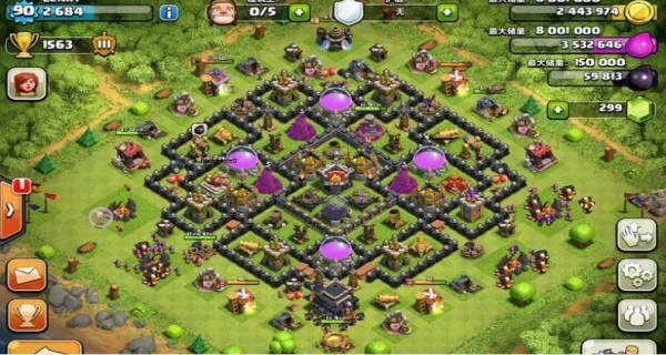 4电塔护黑,aoe的分布也比较合理,这个阵我先后换过2次,第一次是满9级墙不久后,还有一次是满4电塔后,第一次换的时候显然防御还不到位,被凉拖王爆过黑油,汽球、山猪等等…虽然看上去阵形不错,可是欠缺一定的引导,胖子只要一进来火力被吸引过去双王就很容易跑到中间直取黑油罐。