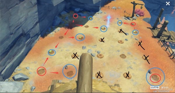 老臭的挖宝游戏位于丹砂崖下方小木屋。前去璃月层岩巨渊的七天神像。之后直接从旁边悬崖飞往下方茅草屋旁。找到老臭,与其对话,挑选开始挖宝游戏,随即便可以前往屋前的空地挖宝。游戏原理:空的表明前后左右也没炸药桶、蔬菜表明前后左右有1个炸药桶、矿石表明前后左右有2个炸药桶、宝箱的前后左右都是炸药桶(类似扫雷)。
