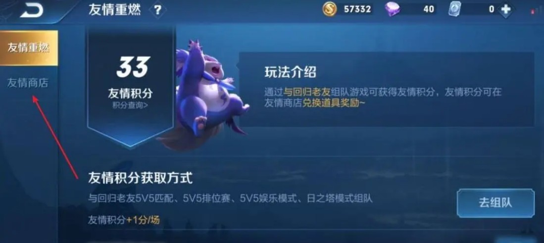 在友情重燃商店中,需要兑换里边的道具需要消耗友情币道具,友情币是玩家与重归朋友组队游戏才能够获得,回归玩家通过与任何朋友组队参与游戏,每一局成功清算后即可获得1枚友情币,平民玩家就需要与回归玩家组队参与游戏,每一局成功清算后即可获得1枚友情币;获得友情币起效的游戏模式包含5V5排位赛、5V5王者荣耀、5V5梦境大乱斗;完成友情重燃每周任务也能获取额外的友情币。