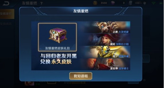 在友情重燃商店中,需要兑换里边的道具需要消耗友情币道具,友情币是玩家与重归朋友组队游戏才能够获得,回归玩家通过与任何朋友组队参与游戏,每一局成功清算后即可获得1枚友情币,平民玩家就需要与回归玩家组队参与游戏,每一局成功清算后即可获得1枚友情币;获得友情币起效的游戏模式包含5V5排位赛、5V5王者荣耀、5V5梦境大乱斗;完成友情重燃每周任务也能获取额外的友情币。