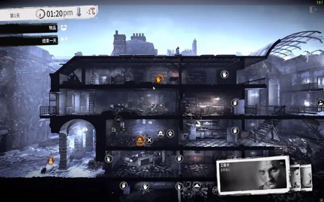 在这个游戏中,我们扮演的是一个平民,每一天需要努力寻找食物、药品、武器等物品来维持存活。生活在战争时代,每个人都面临随时可能失去生命的危险,这一点在游戏里获得了充分地展现。游戏玩法非常有代入感,当我们身边的人因为缺乏食物或药品而死去时,我们不禁思考这些生命是否可以被拯救。当小孩子向我们求助寻找药品时,我们要考虑为了自己的存活,是否要为了拯救他们而探险。每一个决定都会影响游戏玩家的生存状况,这也使得游戏更加真实。
