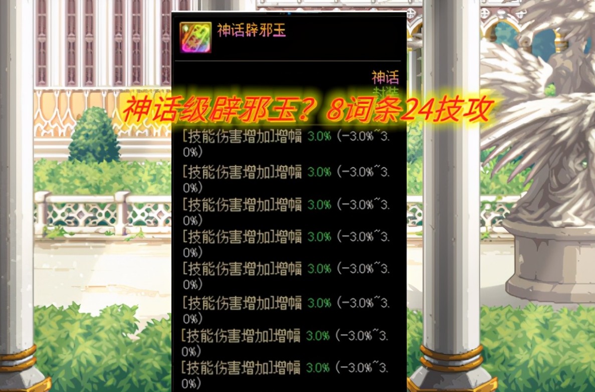 3.宝哥在辟邪玉获得过程中,也是测试过这个词条,在将3%全部属强提高的辟邪玉更换后,伤害上升了300亿左右,在换算具体提高数值后,实际大致为4.5%,从这也能看出10到15级技能加成的辟邪玉内部,本来就是乘算的机制。而相对于3%技能攻击力的满属性,这个提高实际要弱一点,但是相对于2.7%技能攻击力左右的辟邪玉,10到15级技能的挑选就更强了。
