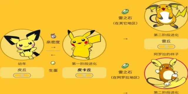 在《宝可梦》中,皮丘需要自身亲密度达到220以上或友好度达到158以上,并进行等级提升之后才可进化成皮卡丘。皮卡丘有两种不同的进化方式,在不同的地区进化方式也不同,具体如下:在其他地区或究极空间,皮卡丘可以使用雷之石完成2阶进化,进化为雷丘。在阿罗拉地区,皮卡丘可以使用雷之石完成2阶进化,进化为雷丘,但此时是阿罗拉的样子,并具有超能力属性。