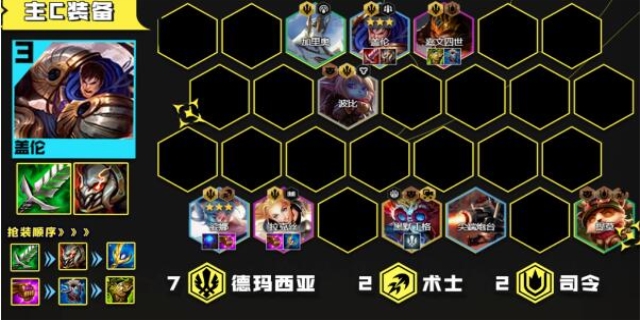 阵容搭配。能选盖伦、德莱厄斯、瑟提、亚托克斯、沃里克、内瑟斯、嘉文四世、娑娜等英雄,主要羁绊包括5德玛、3约德尔、2主宰、2术士、2司令等。