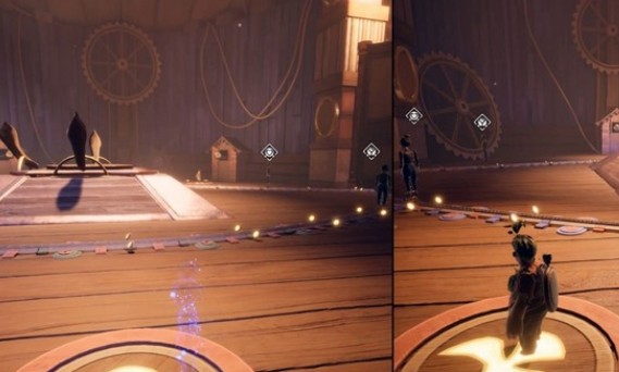 第五点,看到猫头鹰雕像,科迪把它复原。能够看见前方有踏板,小梅站上来,随后科迪松鼠踏板可以将小梅弹到对面。在到了对面科迪控制下图的设备,升至最高,随后小梅放分身,降下去小梅用分身来到上层,再升起来就能达到上层了。第六点,需要踩3个按键,科迪1个,小梅及其分身各一个,踩下2个的好像瞬移到分身就能完成。踏板出来后,小梅站在踏板上,科迪把它弹出去,小梅落地后踩开关,最终回合。