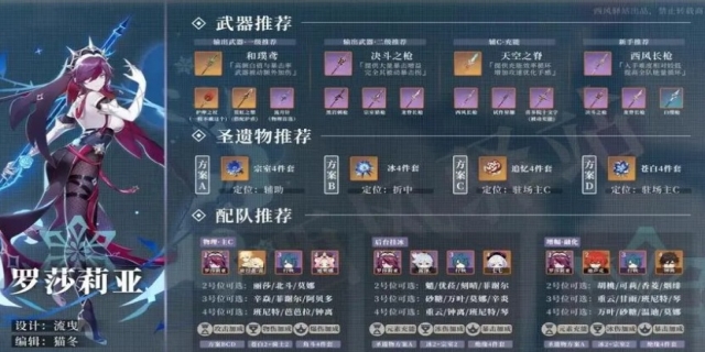 罗莎莉亚辅助圣遗物及武器搭:武器选择:罗莎莉亚的武器选择应当以提升暴击率和攻击力为主。其中,决斗之枪是较为理想的选择,因为它提供了36.8%的暴击率,可以极大地帮助罗莎莉亚达到100%的暴击率要求,从而更好地为全队提供增伤效果。此外,和璞鸢与白缨枪也是不错的选择,分别提供22.1%和23.4%的暴击率。