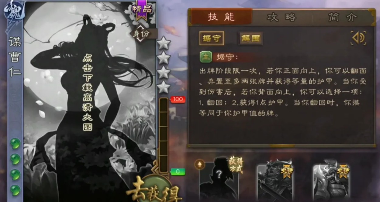 随后他的技能得到了提升,从摸三张牌到摸四张牌,再加上一个救场的技能,从而提高了回合外成活率。那么与之配合的武将有曹丕和满宠这种翻面的武将,他们可以把曹仁翻过去,在第一回合中,他可以先对曹丕造成伤害,让他先翻面,然后用技能翻回来,提高技能的使用效率。满宠就比较简单,只需不弃牌就可以翻回来。国战中他的技能也不再是害人害己,结束阶段,你可以摸X张牌,挑选一项:1.废置一张不为装备牌的手牌;2.使用一张装备牌。若X大于2,则你翻面(X为亮明势力数)。这个技能要看势力数来定,因此收益还是很可观,大大的提高了回合外生存能力。