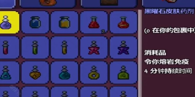 制作黑曜石药剂的详细步骤:1、玩家需要准备制作黑曜石药剂所需的四种材料:水瓶、黑曜石、幌菊和火焰花。水瓶的制作较为简单,当玩家处在水中时,可以直接用空瓶制作获得。
