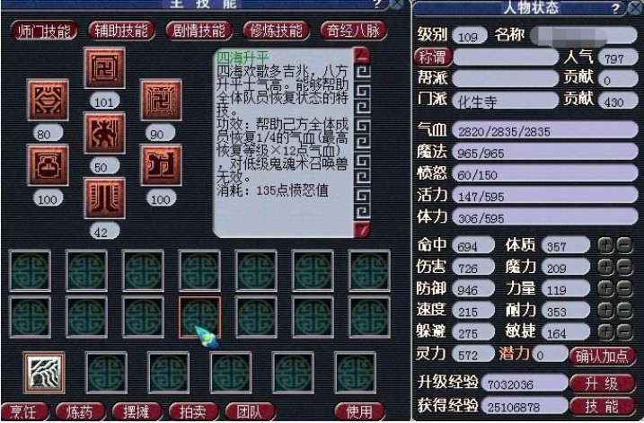 3、3耐2体:有了这样的加点方法,也就不再畏惧5力的强烈冲击啦,由于无数的事实都在证实,3耐才是化生的安全保障。不过也存在一个难以避免的缺陷,那便是蓝少,可化生为了能在PK中一决雌雄,有时不得不这样加点。因此,想抵抗高攻法派,又想要受得了修改后的高灵法系门派还有法宠,对于化生而言还是比较困难的问题。