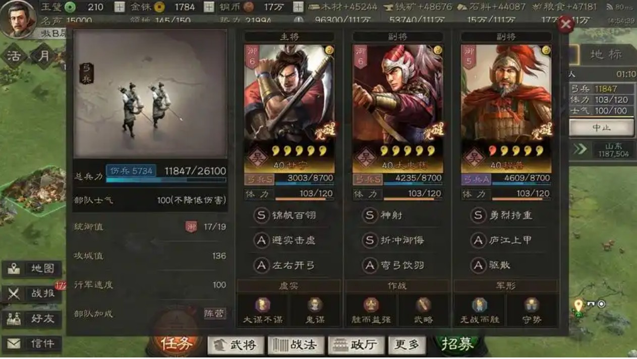 在游戏中,玩家需要合理地配置甘太程的战法和兵书,以最大化他们的战斗潜力。例如,甘宁可以携带能够提高暴击率和暴击伤害的战法,太史慈可以携带提供先手破防和抵御效果的战法,而程普则可以携带增加防御和控制敌方的战法。兵书的选择也应该围绕提升这些武将的核心能力进行。甘太程仍然是一个受欢迎的组合,尤其是在追求快速解决战斗和高爆发输出的玩家中非常受青睐。玩家社区中有关于甘太程的讨论和分享,展示了不同的战法搭配和战斗策略。