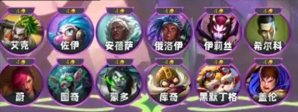 这些四费卡包括:安蓓萨:外交官、征服者、迅击战士;蔚:执法官、搏击手;库奇:极客、炮手;希尔科:炼金男爵、统领;伊利斯:黑色玫瑰、双形战士、格斗家;黑默丁格:皮城学院、先知;蒙多:试验品、统领;图奇:试验品、狙神;艾克:执野火帮、极客、伏击专家;俄洛伊:蓝发小队、哨兵;佐伊:蓝发小队、法师;盖伦:外交官、监察。