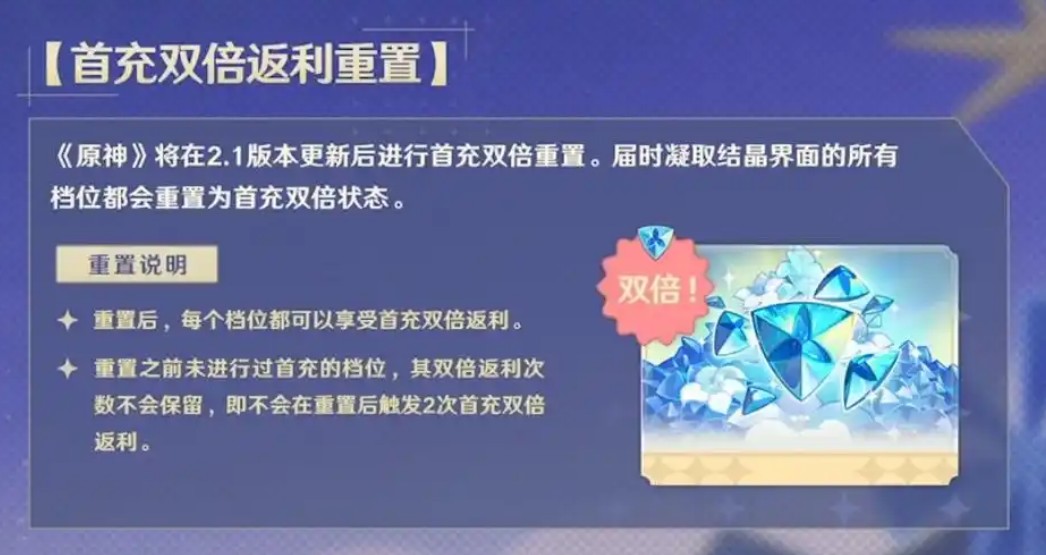双倍充值:按照官方消息,双倍特惠活动是两个月一个循环,即至少两个月开展一次重置刷新。比如,如果玩家在3月15日充值了双倍,那么在3月15日至5月15日期内,也没有双倍特惠活动,必须等到5月15日才能够再次获得双倍充值。每一个月的1号和15号都是双倍充值的重置时间,如果在此期间充值了双倍,那这俩月是不能再次享受双倍充值的。需要注意的是,这些具体时间可能会因为官方调节而发生变化,所以玩家在进行双倍充值之前,建议查看官方最新公告,以保证能够获得双倍充值的优惠。