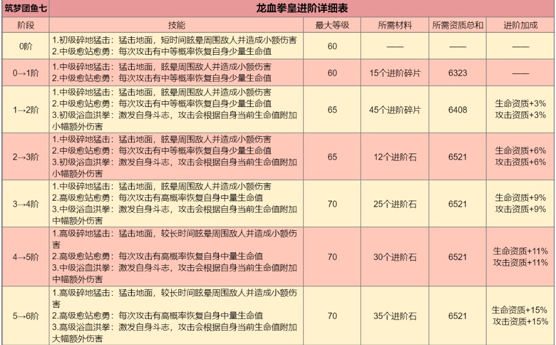 龙血拳王:融合具体方法:45级巨角拳王 + 45级霸王龙 + 8个融合石;霸王龙饲料:松露 + 土豆包 + 优质肉(13包稳定);升级材料:322 + 645=967包高级宠物粮;龙血拳皇:融合具体方法:50级龙血拳王 + 50级暗黑霸王龙 + 16个融合石;暗黑霸王龙饲料:象拔蚌 + 罕见肉 + 稀有肉(55包稳定);升级材料:484 + 968=1452包高级宠物粮;进阶资质:1阶:必须要15个龙血拳皇进阶碎片,资质为6323;2阶:必须要45个龙血拳皇进阶碎片,资质为6480;3~6阶:必须要相应数量的龙血拳皇进阶石,资质为6521。