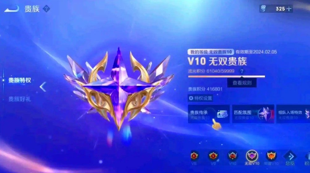 在《王者荣耀》中,VIP10玩家可以获得一款专属的传说皮肤,即艾琳的“觅芳踪”皮肤。新皮肤是V10贵族专属皮肤,至少要达到贵族10级才能获取。设计部门结合艾琳自身的英雄特点,以蝴蝶为基础主题,给她打造出了一个全新的蝴蝶妖灵形象。这款皮肤的特效中融入了蝴蝶、团扇、云纹、虚影等元素,塑造了一个多情念旧的美丽妖灵。贵族10的其他特权皮肤共享:贵族10召唤师跟朋友组队进行游戏的时候,朋友可以使用贵族10召唤师所拥有的全部永久皮肤(艾琳-女武神除外)。每个朋友能够在一周内使用这位贵族10客户的皮肤五次,超出5次就不能使用了,但这个使用频率会在下周获得刷新。新身份和特权:贵族系统更新后,增加了V10无双贵族与V10荣誉贵族身份,包含【首款】全屏天慕、贵族专属匹配氛围和专属华丽称号等奖励。还有全新【传承】特权,可绑定亲密好友或账户其他角色分享账户英雄和皮肤使用权,以及新增贵族节日福利好礼。