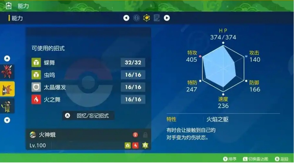 技能:火之舞 蝶舞/虫鸣 太晶爆发 终极吸取/替身 其他配招方案 蝶舞+终极吸取+火之舞+虫鸣,道具选择气息腰带。蝶舞+终极吸取+火之舞+虫鸣+热风,用于对面的辅助或被克制精灵。蝶舞+猛毒+虫鸣+热风,用于有可靠的队医或对面没有高伤害的情况下。蝶舞+虫鸣+热风+歇息,用于顺风和猛毒给予队友空间。蝶舞+火放+大吸+虫鸣,用于对付蛋神。蝶舞+替身+火放+大吸,用于对付剧毒和提高回血。