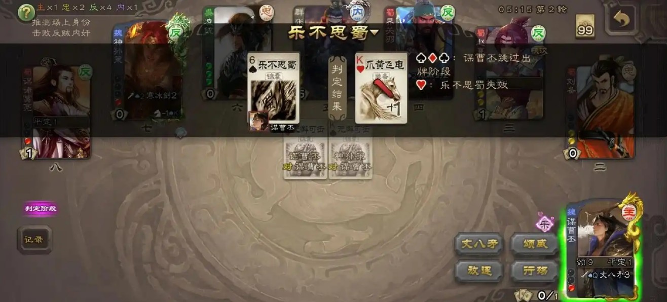 判定结果:若判定牌为红桃,则“乐不思蜀”无效,目标角色能够顺利进行出牌阶段;若判定牌给其他花色,“乐不思蜀”起效,目标角色跳过出牌阶段。改判机制:部分武将技能能够改变判定结果,如司马懿的“鬼才”和张角的“鬼道”。注意事项:无懈可击的应用:要对“乐不思蜀”使用“无懈可击”,必须在目标角色回合的判定阶段打开判定牌之前使用。多个延时锦囊的判定顺序:当一名角色的判定区有多个延时锦囊时,后放置的锦囊先判定。与其他技能的互动:比如,貂蝉被“乐不思蜀”判定失败后,回合结束时仍可发动“闭月”技能。
