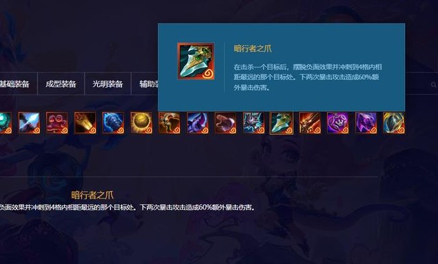 合成信息:合成路线:考尔菲德的战锤(1100金币)+锯齿短匕(1100金币)+800金币总花费:3000金币;装备定位与适用英雄:装备定位:暗行者之爪是一件杀手类神话装备,适合需要突进和爆发能力的英雄。适用英雄:盲僧、瑟提、杰斯、派克、锐雯等英雄都可以利用其主动技能和属性提高在游戏中的表现。版本历史:暗行者之爪在10.23版本做为神话装备添加到游戏中,在13.10版本调整至传说装备,在14.1版本从游戏中移除。