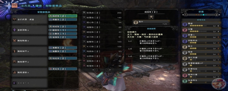 盾斧配装:打了快1000把,发现盾斧很多时候输出不足并不是因为操作不正确,只是因为盾斧的攒红盾红剑加超捷的一套流程过长,只要是被打,单挑的时候往往会因为残血吃药喝个几秒被怪物追身无限连,之后再去攒6瓶就会很难受衰。这套蘑菇套秒吃药,可以确保残血瞬间吃药继续以前的流程。并且盾斧需要的全都有。几本操作不失误死不了。简易怪切电锯直接锯死就好。可惜没刷出来一颗强壁珠,如果刷出来就能把钢刃换了,就更无敌了。